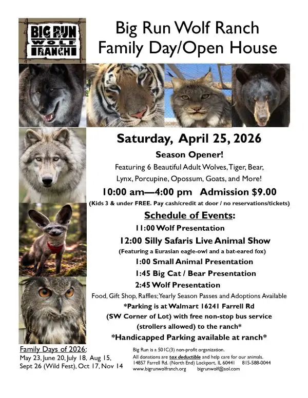Big Run Wolf Ranch is open to the public for family days and open houses. Come see wolves, our tiger and bear, and more! There’s plenty of fun for the whole family with food, drinks, and raffles.